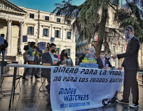 Concentrados frente al Congreso de los Diputados, varios activistas de diversas organizaciones, entre las que se cuenta ATTAC, Amigos de la Tierra, Auditoría Ciudadana de la Deuda en Sanidad, Ecologistas en Acción, Extinction Rebellion, Feministas por el Clima, Greenpeace, Juventud por el Clima–Fridays for Future, Observatorio de Multinacionales en América Latina–Paz con Dignidad, Plataforma de Afectados por la Hipoteca, Plataforma contra los Fondos Buitre y Red Ecofeminista, han representado el «reparto del pastel» en referencia a la previsible adjudicación desigual de los fondos de recuperación europeos tras la crisis de la COVID–19.