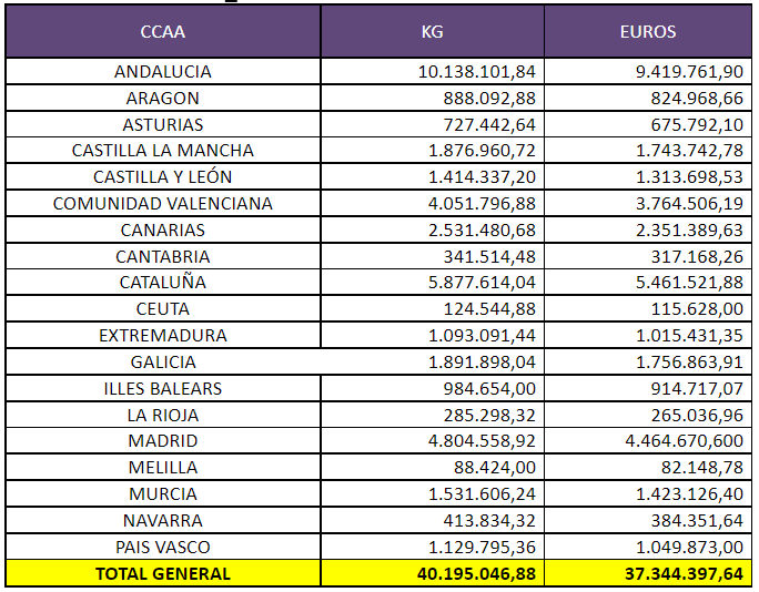 Este volumen de alimentos de la segunda fase, que se desarrolla entre el 13 de septiembre y el 1 de octubre, supone el 60 % de las cantidades totales a distribuir en el programa 2021. Los alimentos se entregan en todas las provincias españolas a los centros de almacenamiento y distribución de las organizaciones asociadas.