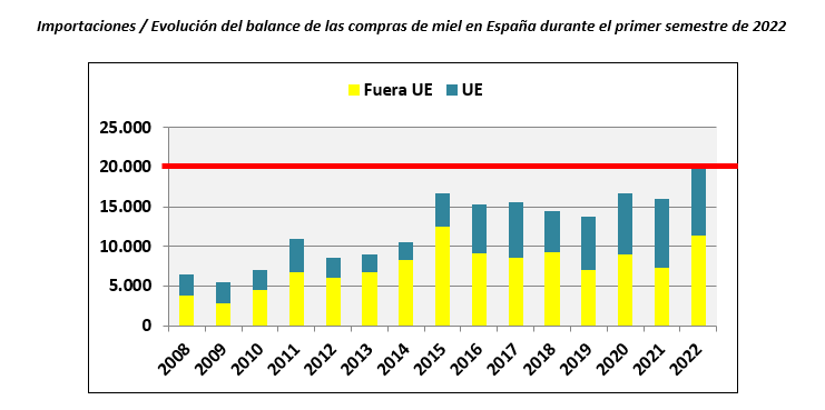 Entre enero y junio de 2022 los operadores españoles adquirieron un total de 20.243 toneladas de miel (4.221 toneladas más que en el mismo semestre del año 2021). El nivel de compras de miel durante este primer semestre se situó en niveles muy superiores a los de primeros semestres de años anteriores: nunca se había importado tanta miel en España durante un primer semestre como este año.