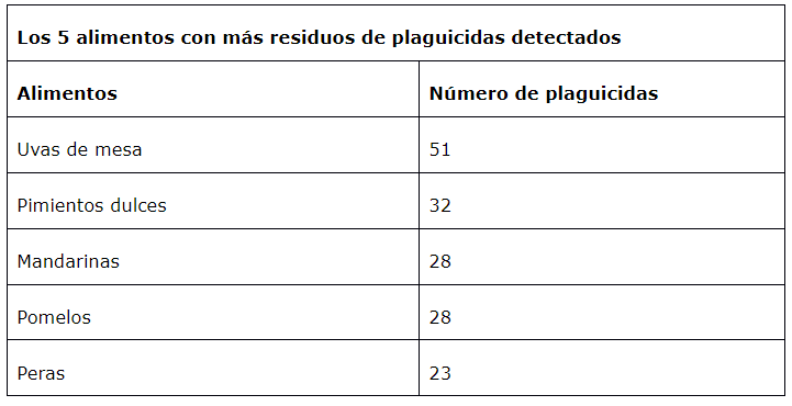 Los dos alimentos con mayor número de plaguicidas fueron las uvas de mesa con 51 sustancias (28 disruptores endocrinos) y los pimientos dulces con 32 (18 disruptores endocrinos). En cuanto a las muestras de origen animal, el 3,39 % contenían plaguicidas.
