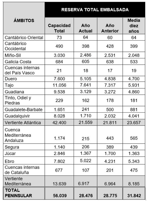 La reserva hídrica española está al 50,8% de su capacidad total. Los embalses almacenan actualmente 28.476 hectómetros cúbicos (hm³) de agua, aumentando en la última semana en 188 hectómetros cúbicos (el 0,3% de la capacidad total actual de los embalses).