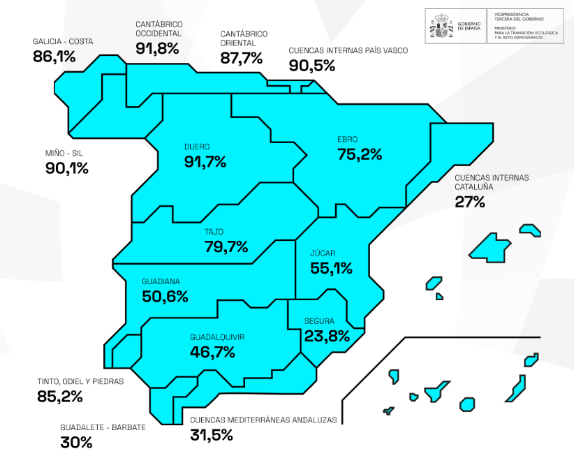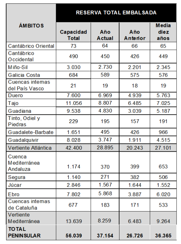 La reserva hídrica española está al 66,3% de su capacidad total. Los embalses almacenan actualmente 37.154 hectómetros cúbicos (hm³) de agua, aumentando en la última semana en 1 hectómetro cúbico (el 0,0% de la capacidad total actual de los embalses).