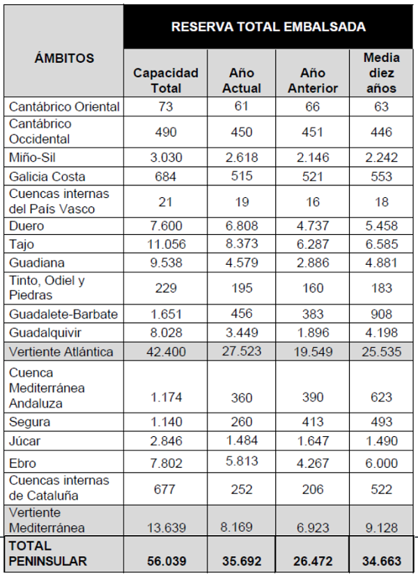 La situación de las cuencas, en hectómetros cúbicos, se detalla en el cuadro adjunto: