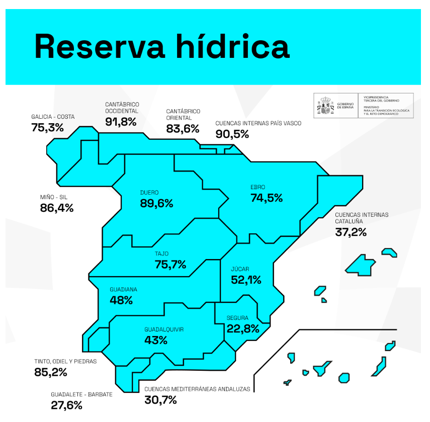 La reserva hídrica española está al 63,7% de su capacidad total. Los embalses almacenan actualmente 35.692 hectómetros cúbicos (hm³) de agua, disminuyendo en la última semana en 329 hectómetros cúbicos (el 0,6% de la capacidad total actual de los embalses).