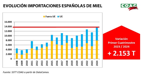 Durante el primer cuatrimestre de 2024, España ha importado más miel “low-cost” que nunca. El último informe elaborado por los servicios técnicos del sector apícola de COAG así lo constata: entre enero y abril de 2024 los operadores españoles adquirieron un total de 13.653 toneladas de miel (2.153 toneladas más que en el mismo cuatrimestre del año 2023).