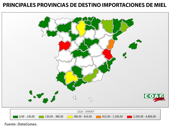 - Durante este primer cuatrimestre, las provincias españolas más compradoras de miel barata han sido Valencia, Salamanca, Castellón, Burgos, Sevilla, Huesca y Granada. (ver mapa adjunto en email).