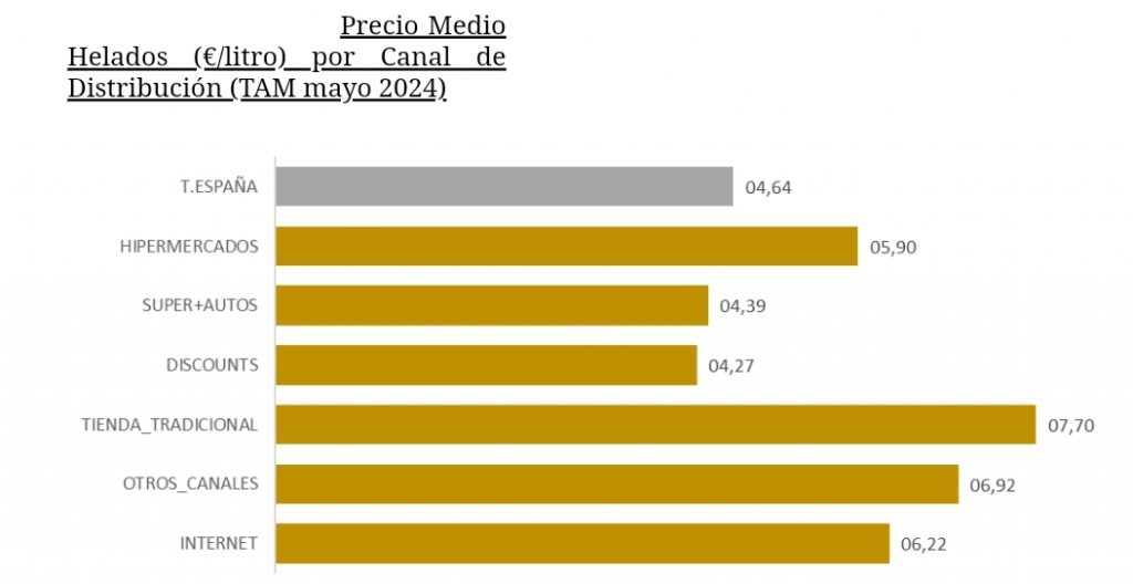 El supermercado destaca como canal favorito de los españoles para la compra de helado (donde se adquiere el 65 % de los litros totales), seguido de las tiendas de descuento y el hipermercado. La tienda tradicional e internet son los canales con menos importancia en volumen dentro de esta categoría.