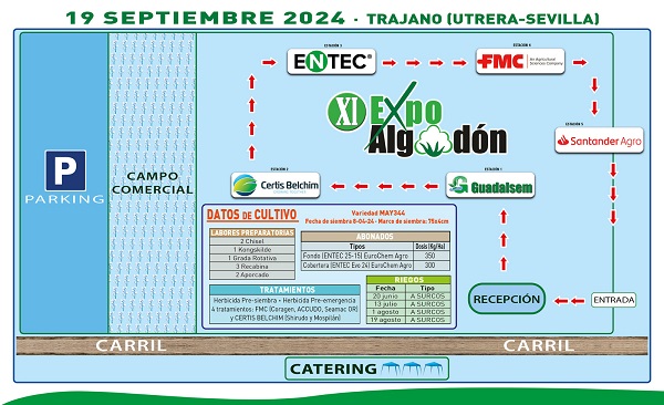 La XI edición de Expoalgodón tendrá lugar el próximo 19 de septiembre, y consistirá en una jornada de campo con un circuito técnico enfocado a profesionales del sector. La parcela elegida está situada en la pedanía utrerana de Trajano, donde el algodón se encuentra en la recta final de su ciclo, apto para la aplicación de defoliante y con casi la mitad de las cápsulas abiertas. Aunque sufrió algún ataque de earia insulana, se pudo controlar con el tratamiento.