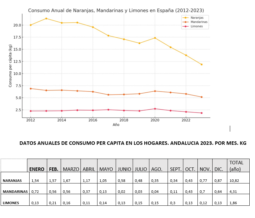 Pese a constituir la mejor fuente natural de vitamina C, pese a su valor nutricional y su carácter saludable, el consumo de mandarinas y especialmente de naranjas, lleva más de diez años retrocediendo en nuestro país (ver gráfica). Este retroceso es aún mayor en Andalucía, que es además la primera región productora de naranja de España.