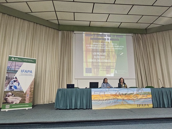 La presidenta del Instituto Andaluz de Investigación y Formación Agraria, Pesquera, Alimentaria y de la Producción Ecológica (Ifapa), Marta Bosquet, y la directora general de Ayudas Directas y de Mercado de la Consejería de Agricultura, Raquel Espín, han inaugurado en el centro Ifapa de Los Palacios y Villafranca (Sevilla) la primera jornada de formación para el desarrollo de las Intervenciones sobre Desarrollo Rural del PEPAC en algodón y remolacha.