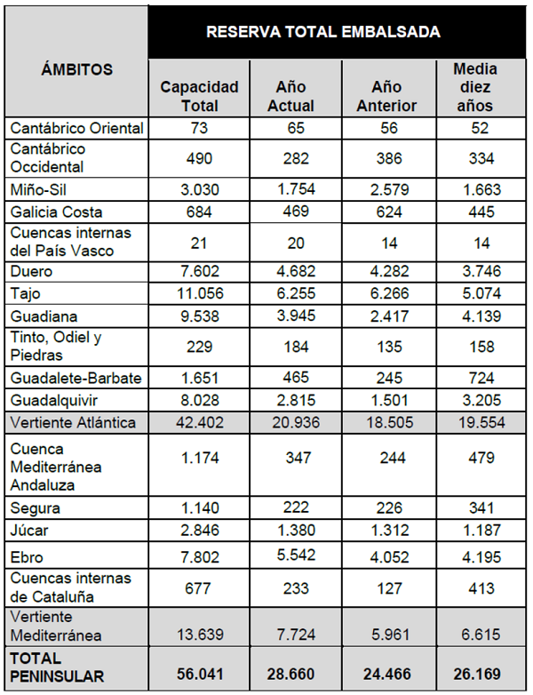 La reserva hídrica española está al 51,1% de su capacidad total. Los embalses almacenan actualmente 28.660 hectómetros cúbicos (hm³) de agua, disminuyendo en la última semana en 56 hectómetros cúbicos (el 0,1% de la capacidad total actual de los embalses).