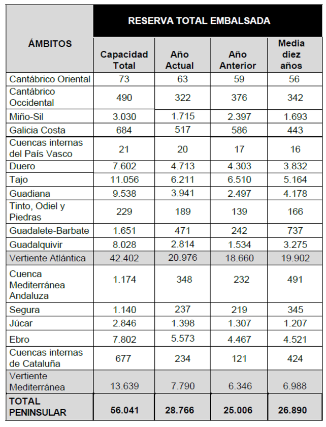 La reserva hídrica española está al 51,3% de su capacidad total. Los embalses almacenan actualmente 28.766 hectómetros cúbicos (hm³) de agua, aumentando en la última semana en 128 hectómetros cúbicos (el 0,2% de la capacidad total actual de los embalses).