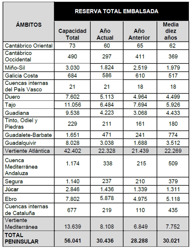 La reserva hídrica española está al 54,3% de su capacidad total. Los embalses almacenan actualmente 30.436 hectómetros cúbicos (hm³) de agua, aumentando en la última semana en 1.294 hectómetros cúbicos (el 2,3% de la capacidad total actual de los embalses).