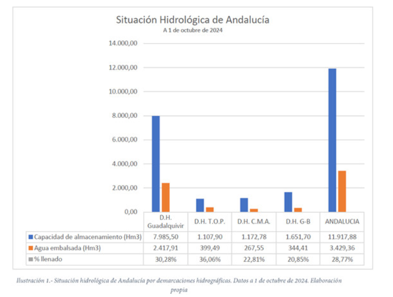 Pero de proyecciones no vive el regadío, y la realidad actual de la Cuenca Mediterránea Andaluza no puede ser más preocupante. Los embalses están por debajo del 30% de su capacidad en esta Cuenca. Sin embargo, las últimas lluvias -ha señalado el autor del informe, Francisco Carrasco- han extendido la percepción engañosa” de que “la sequía ha acabado” en Andalucía, cuando la realidad es la contraria y los recursos hídricos superficiales se encuentran en valores mínimos en la mayoría de sistemas de casi todas las cuencas, con una situación casi desesperada en el Guadalete-Barbate, con los embalses al 29% de su capacidad y muy preocupante también en el principal sistema del Guadalquivir, la Regulación General, por debajo del 28%.