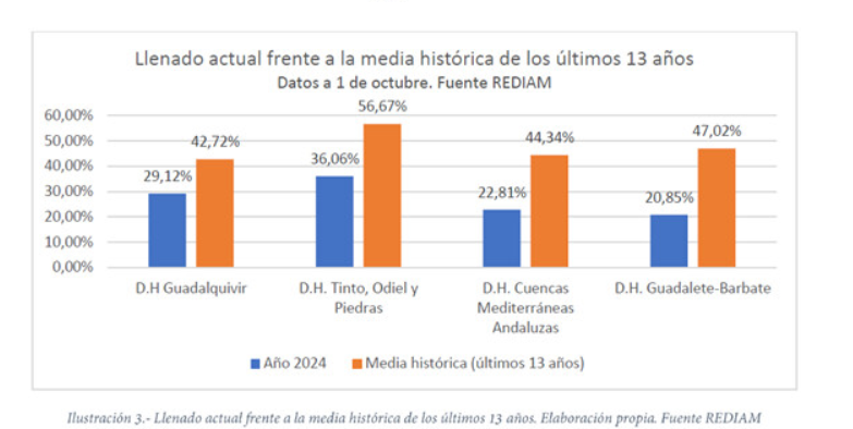 En concreto, la cuenca mediterránea andaluza comenzó el actual año hidrológico (el pasado 1 de octubre) con un nivel de agua embalsada de sólo el 23% de su capacidad total, siendo la media histórica de los últimos trece años del 44%.
