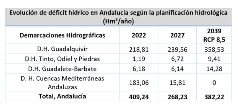 Y es que, según siempre la propia planificación hidrológica, en los próximos 14 años la insuficiencia de recursos en las cuencas del Guadalquivir, Guadalete-Barbate y Tinto-Odiel-Piedras no sólo no se resolverá sino que se agravará en un 65%, pasando el desajuste entre la oferta y la demanda de 226 a 382 hm3, como consecuencia de la incidencia del cambio climático y el incremento de la demanda ambiental.