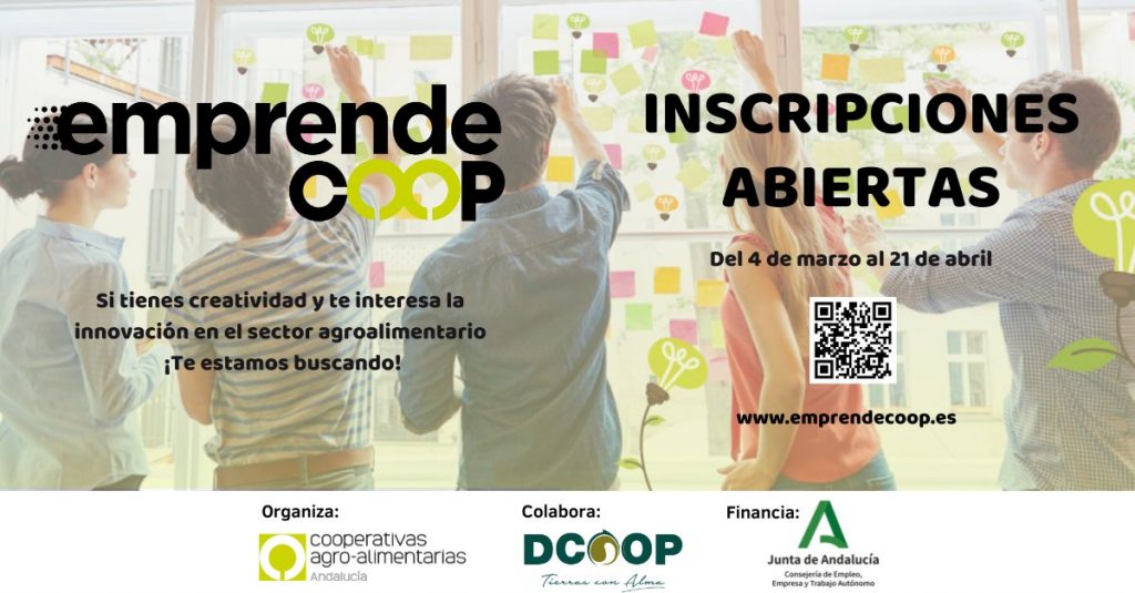 Desde ayer, 4 de marzo, y hasta el 21 de abril, permanecerá abierto el plazo de solicitud para tomar parte en el proyecto ‘Emprendecoop’, una iniciativa promovida por Cooperativas Agro-alimentarias de Andalucía en colaboración con la cooperativa Dcoop, cuyo objetivo no es otro que el de impulsar el ecosistema emprendedor en el sector agroalimentario ofreciendo a los participantes las herramientas necesarias para potenciar su creatividad.