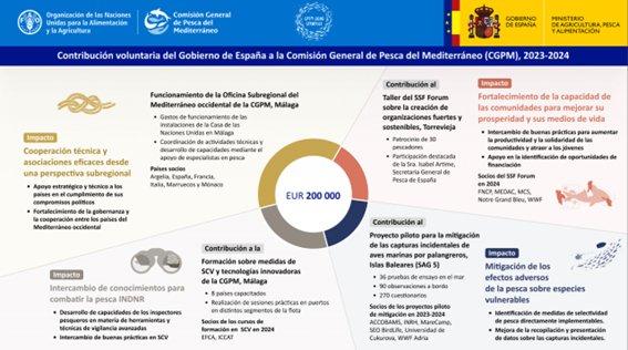Las actividades financiadas abarcan desde acciones en materia de cooperación técnica y gobernanza, pesca de pequeña escala, mitigación de capturas accidentales de aves marinas y formación en materia de inspección y control pesquero. Además, hay que destacar la puesta en marcha de la sede de la oficina de la CGPM para el Mediterráneo occidental en Málaga, una muestra más del fuerte impulso y compromiso del Ministerio de Agricultura, Pesca y Alimentación con la sostenibilidad y objetivos de esta organización.