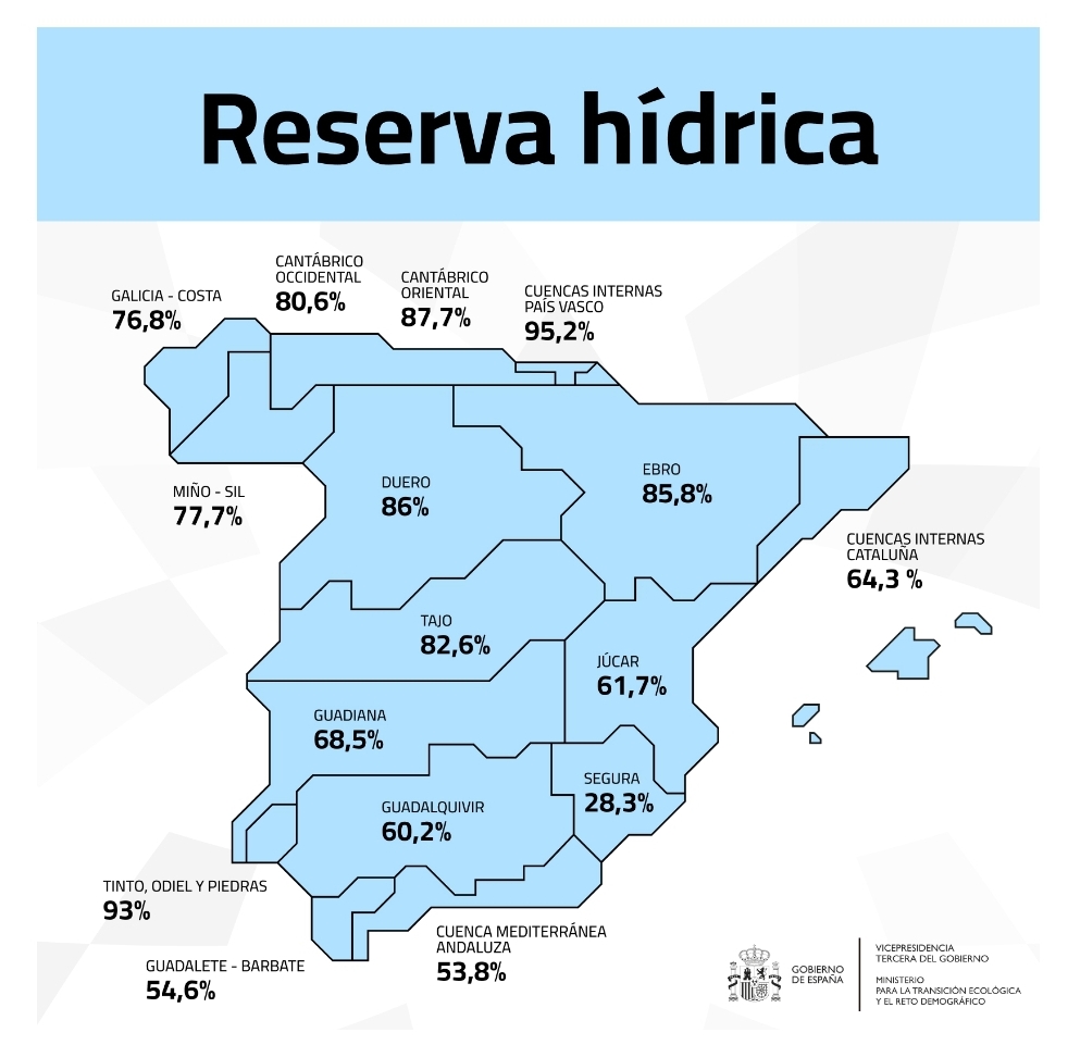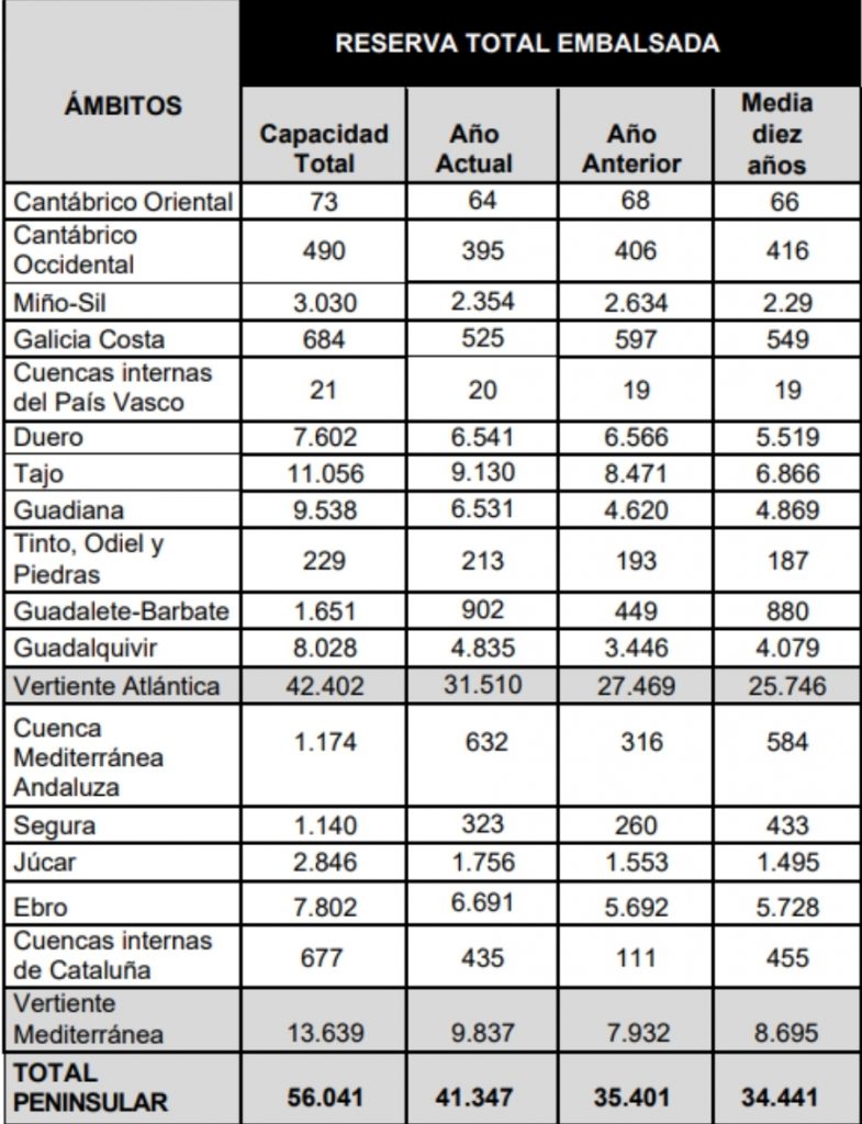 La reserva hídrica española está al 73,8% de su capacidad total. Los embalses almacenan actualmente 41.347 hectómetros cúbicos (hm³) de agua, aumentado en la última semana en 490 hectómetros cúbicos (el 0,9% de la capacidad total actual de los embalses).