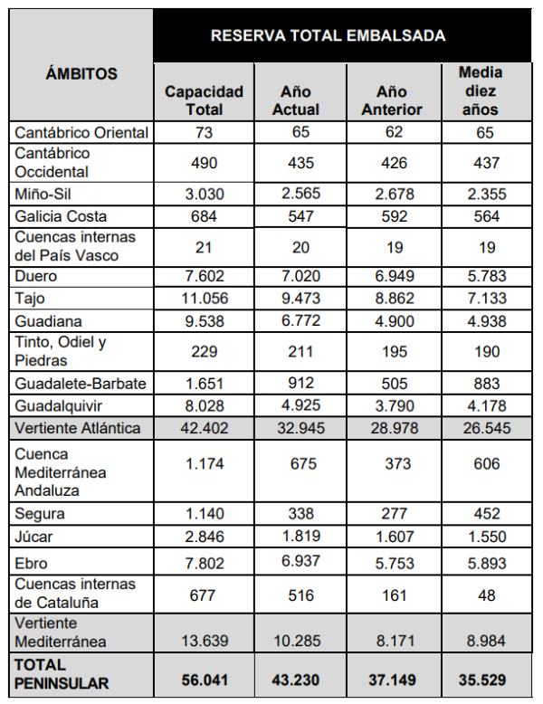 La reserva hídrica española está al 77,1 % de su capacidad total. Los embalses almacenan actualmente 43.230 hectómetros cúbicos (hm³) de agua, aumenta durante este período en 86 hm³ (el 0,2 % de la capacidad total actual de los embalses).