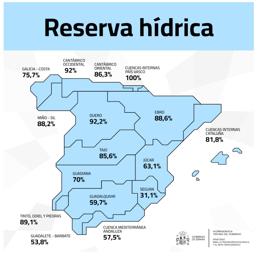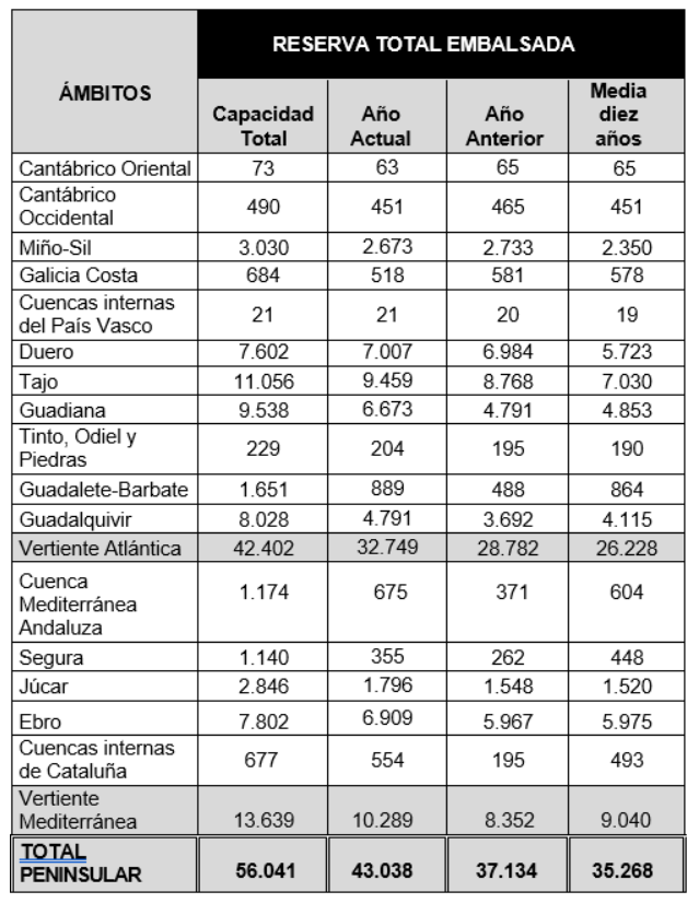 La reserva hídrica española está al 76,8% de su capacidad total. Los embalses almacenan actualmente 43.038 hectómetros cúbicos (hm³) de agua, disminuyendo en la última semana en 374 hectómetros cúbicos (el 0,7% de la capacidad total actual de los embalses).