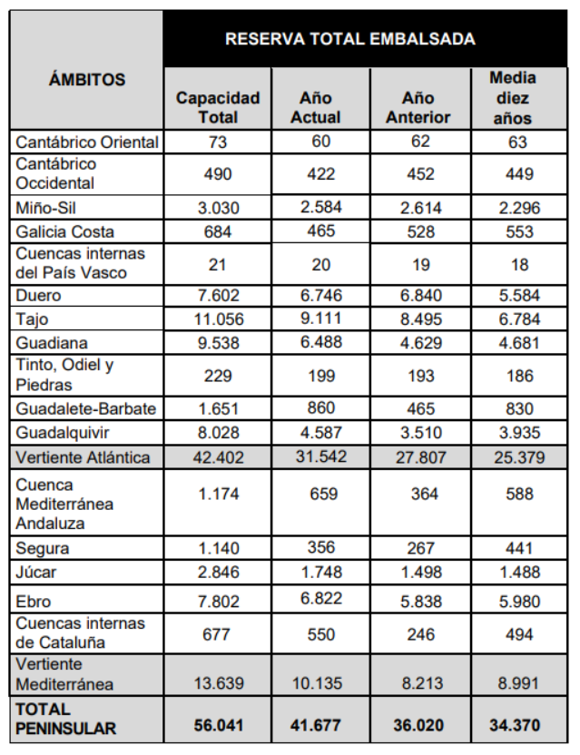 La situación de las cuencas, en hectómetros cúbicos, se detalla en el cuadro adjunto: