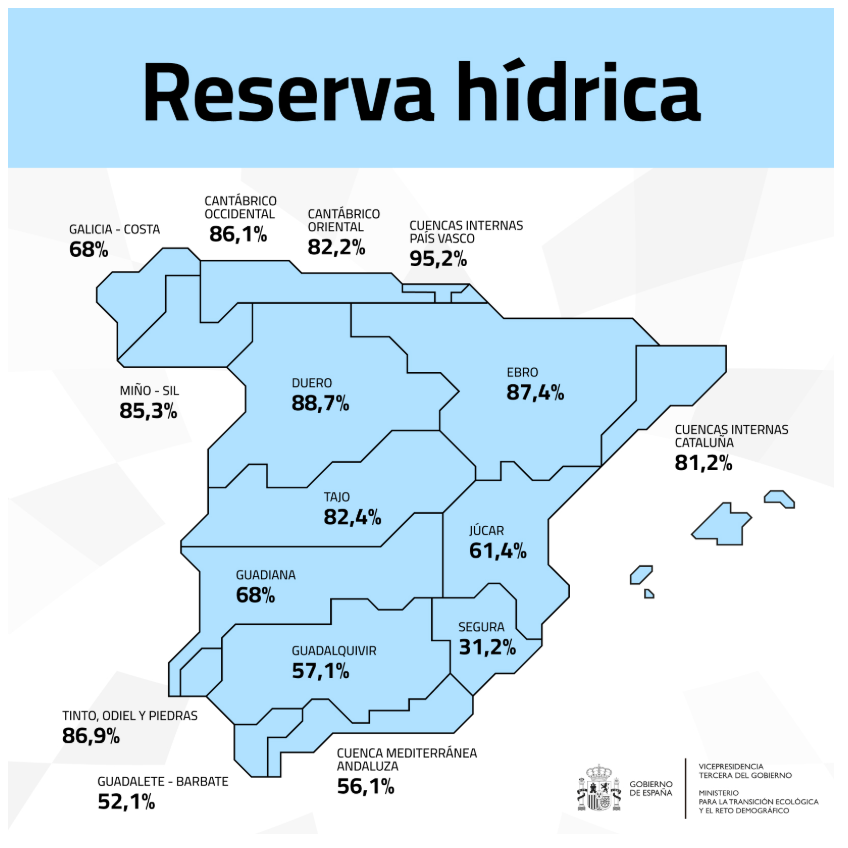 La reserva hídrica española está al 74,4% de su capacidad total. Los embalses almacenan actualmente 41.677 hectómetros cúbicos (hm³) de agua, disminuye en la última semana en 733 hm³ (el 1,3 % de la capacidad total actual de los embalses).