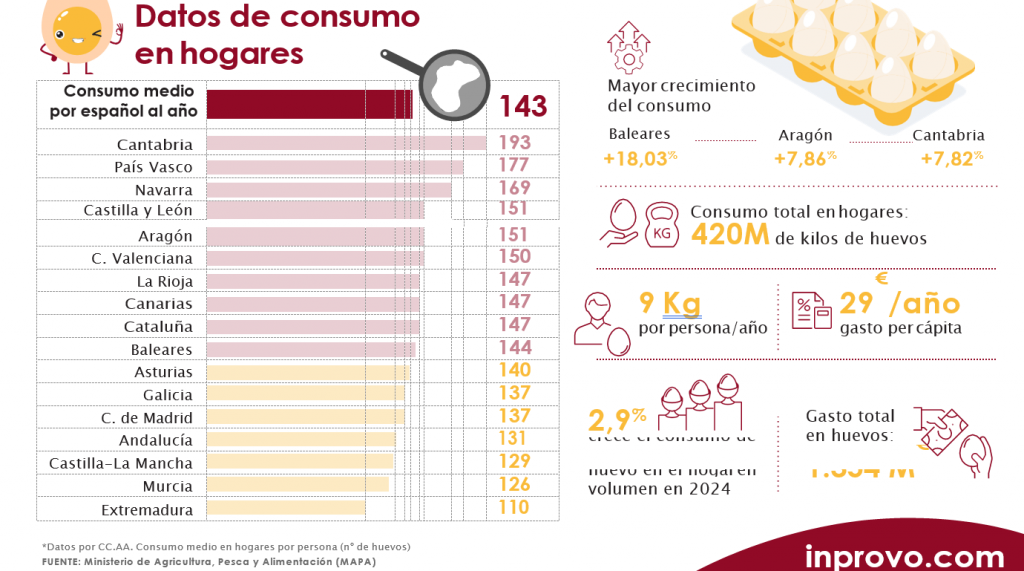 Durante 2024 los hogares españoles han consumido 420 millones de kilos de huevos, lo que representa un consumo per cápita de 9 kilos al mes y una media de 143 huevos por persona al año -casi 1 huevo por hogar al día-, frente a los 137 de 2023.
