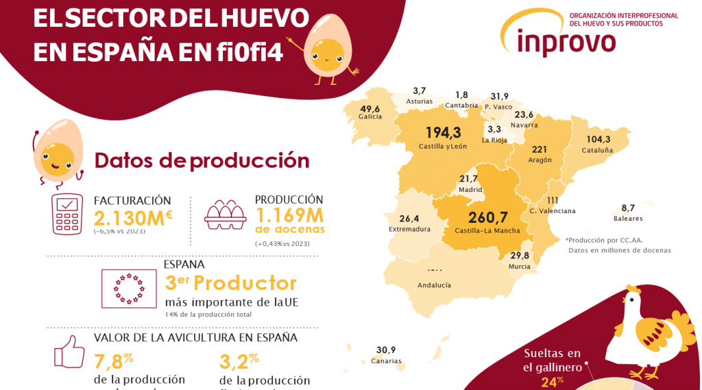 España sigue como tercer país productor de huevos de la Unión Europea, con el 14% de la producción total comunitaria. Además, con 2.130 millones de euros facturados en 2024 (Fuente: MAPA) representa el 7,8% del valor de la producción total ganadera y el 3,2% de la agraria en nuestro país, contribuyendo al desarrollo económico, social y territorial de la España rural, en la que genera unos 15.000 puestos de trabajo directos y en torno a los 60.000 empleos indirectos, con un elevado porcentaje de jóvenes y las mujeres.