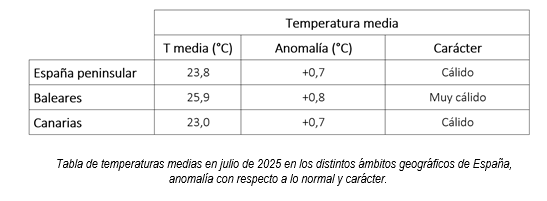Julio de 2025 tuvo un carácter cálido, con una temperatura media en la España peninsular de 23,8 °C, valor que supera en +0,7 °C la temperatura media de un mes de julio promediada con el periodo de referencia 1991-2020. Se trató del decimosegundo julio más cálido desde el comienzo de los registros en 1961y del décimo del siglo XXI.