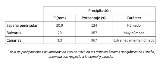 El mes de julio tuvo carácter húmedo en cuanto a precipitaciones, con una precipitación media sobre la España peninsular de 20,9 mm, valor que representa el 124 % del valor normal del mes (periodo de referencia: 1991-2020). Fue el décimo noveno mes de julio más húmedo de la serie desde 1961, y el cuarto del siglo XXI, empatado con julio de 2013. En Canarias fue el julio más lluvioso de toda la serie histórica.