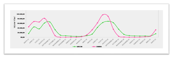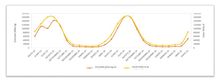 proporción del volumen comprado por los hogares sea diferente por mes y tipo de fruta. Mientras que la sandía concentra su consumo en los meses centrales del verano, el melón presenta una curva ligeramente más prolongada, con un consumo significativo incluso en los meses de inicio del otoño.