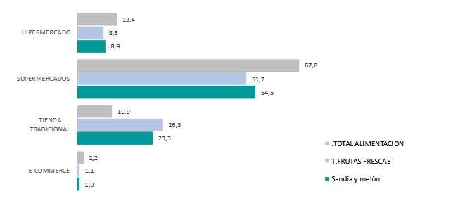 El supermercado es el canal preferido por los españoles para adquirir estas frutas, que concentran el 54,5 % de las compras. Entre las frutas frescas adquiridas en este tipo de establecimiento, el melón y la sandía destacan como las más demandadas. Le siguen las tiendas tradicionales con el 23,3% del volumen total y el hipermercado como tercer canal de distribución.