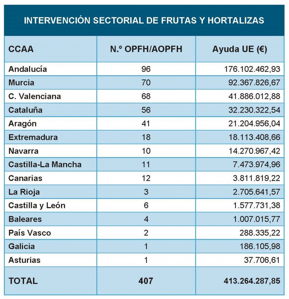 Estas ayudas van a beneficiar a 407 organizaciones de productores de frutas y hortalizas y sus asociaciones repartidas en 15 comunidades autónomas, en función del valor de la producción comercializada. Las principales perceptoras son Andalucía, Murcia, Comunidad Valenciana, Cataluña, Aragón, Extremadura y Navarra.