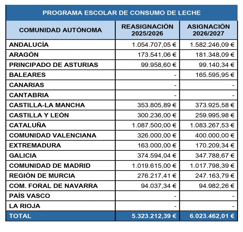 Además, se realiza también una reasignación de fondos correspondientes al curso actual, 2025/2026, por montantes totales de 13,2 millones de euros para el programa de frutas y hortalizas y 5,3 millones de euros para el de leche.