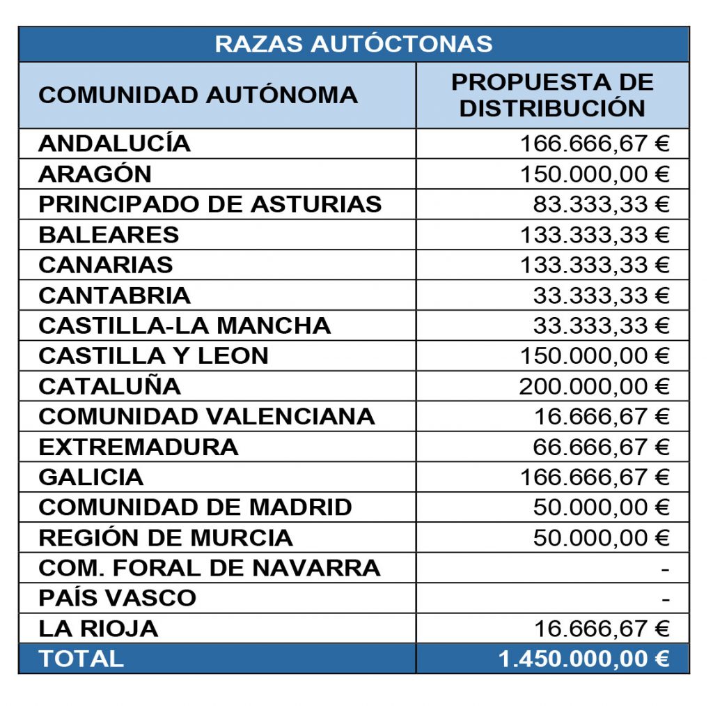 Asimismo, se ha autorizado un crédito dirigido al fomento de las razas autóctonas españolas que asciende a 1,45 millones de euros. Con esta línea, el Ministerio de Agricultura, Pesca y Alimentación da apoyo a las asociaciones de criadores de razas autóctonas reconocidas por las comunidades autónomas para la gestión de los libros genealógicos y el desarrollo de actividades relacionadas con los programas de mejora y de bancos de germoplasma. La distribución propuesta es la siguiente: