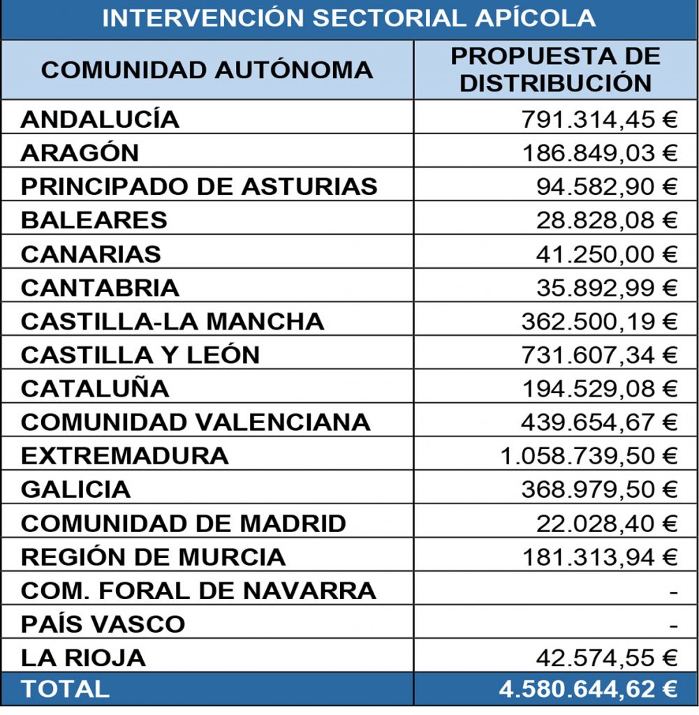 Dentro del programa de Competitividad y Calidad de la Producción y los Mercados, se ha autorizado un crédito por valor de 4,58 millones de euros para la línea de fomento de la apicultura. Para el reparto de esta cantidad se ha tenido en consideración el número de colmenas inscritas en el Registro de Explotaciones Ganaderas (REGA) y, entre otras cuestiones, se financiará el programa oficial de vigilancia de agresiones y enfermedades en esta especie, particularmente de la varroosis. El reparto propuesto es el siguiente: