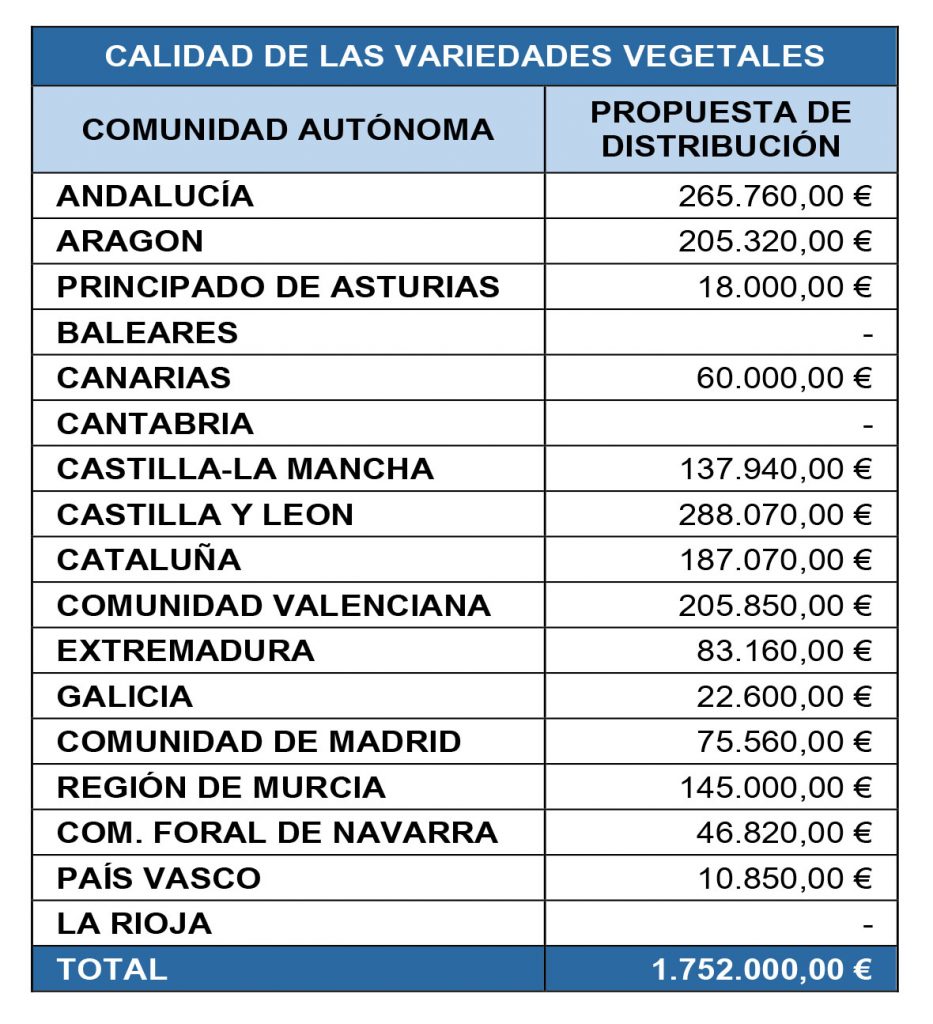 Con un crédito de 1,75 millones de euros, esta línea apoya la ejecución de ensayos que permiten la evaluación agronómica de las nuevas variedades vegetales y el mantenimiento del sistema de certificación, mediante el control de la calidad y sanidad de semillas y plantas de vivero. La propuesta de reparto es la siguiente:
