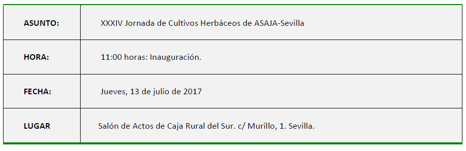 Recién finalizada la recolección del cereal en Andalucía y días antes de que se inicie la recolección del girasol, ASAJA-Sevilla ha programado su XXXIV Jornada de Cultivos Herbáceos, que se celebrará en el salón de actos de la Caja Rural del Sur en Sevilla el próximo 13 de julio y donde se analizará la marcha de estos dos cultivos, que en este ejercicio han estado condicionados por el déficit hídrico, así como la situación de mercado de cereales y oleaginosas.
