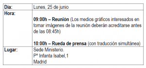 El ministro de Agricultura, Pesca y Alimentación, Luis Planas, se reúne este lunes, 25 de junio, con el comisario europeo de Agricultura y Desarrollo Rural, Phil Hogan. Durante el encuentro, que tendrá lugar a las 09:00h. en la sede del Ministerio, en Madrid, el ministro y el comisario intercambiarán impresiones sobre la próxima Política Agrícola Común 2021-2027 o los aranceles propuestos por Estados Unidos a las exportaciones españolas de aceituna negra de mesa. Al finalizar el encuentro, tendrá lugar una rueda de prensa abierta a los medios a los medios de comunicación.