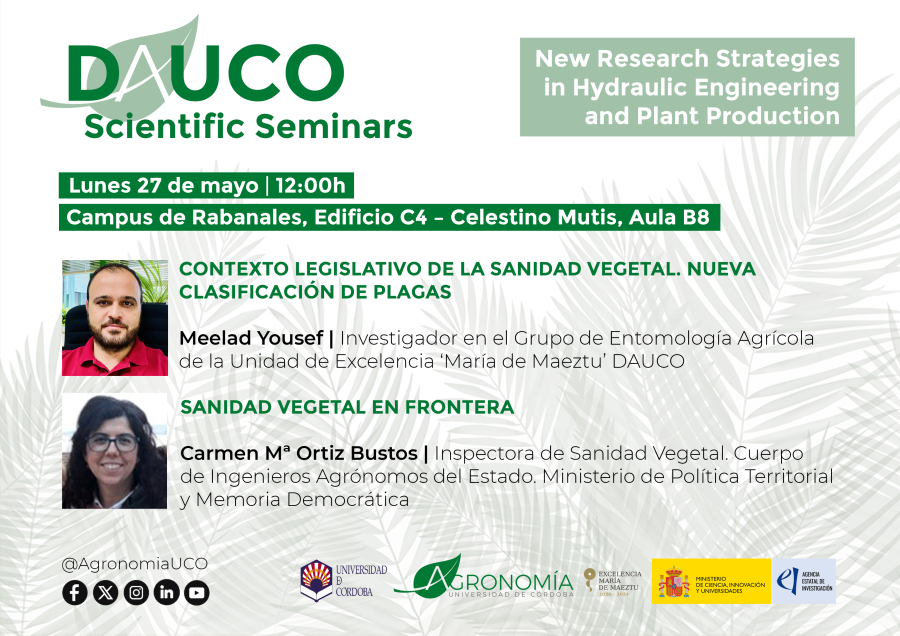 Para arrojar luz sobre la legislación y las políticas de control en esta materia, especialmente importante en un contexto de globalización, el ciclo de Seminarios Científicos en DAUCO contará con el investigador en Entomología Agrícola Meelad Yousef (Universidad de Córdoba) y la inspectora de Sanidad Vegetal Carmen María Ortiz Bustos.