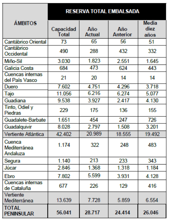 La situación de las cuencas, en hectómetros cúbicos, se detalla en el cuadro adjunto: