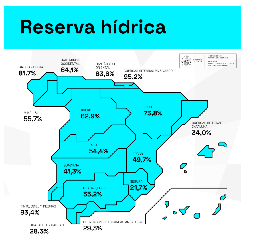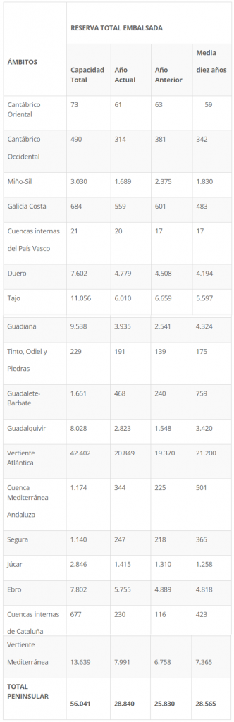 La reserva hídrica española está al 51,5% de su capacidad total. Los embalses almacenan actualmente 28.840 hectómetros cúbicos (hm³) de agua, aumentando en la última semana en 48 hectómetros cúbicos (el 0,1% de la capacidad total actual de los embalses).