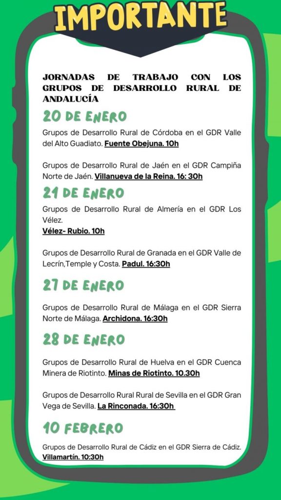 Las reuniones programadas tendrán lugar en las localidades de Villanueva de la Reina (GDR Campiña Norte de Jaén), Vélez -Rubio (GDR Los Vélez, Almería), Padul (GDR Valle de Lecrín, Temple y Costa, Granada), Villamartín (GDR Sierra de Cádiz), Archidona (GDR Sierra Norte de Málaga) y La Rinconada (GDR Gran Vega de Sevilla). Todas ellas cuentan con la sede del Grupo de Desarrollo Rural de su territorio.