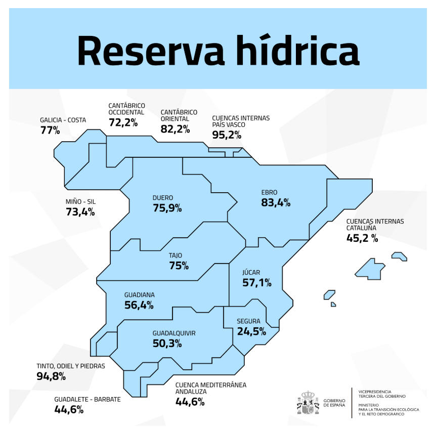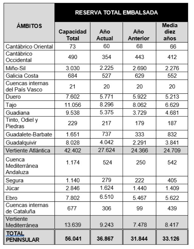 La reserva hídrica española está al 65,8% de su capacidad total. Los embalses almacenan actualmente 36.867 hectómetros cúbicos (hm³) de agua, aumentando en la última semana en 2.751 hectómetros cúbicos (el 4,9% de la capacidad total actual de los embalses).