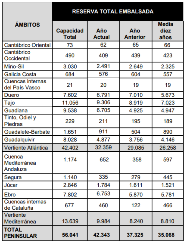 La reserva hídrica española está al 75,6% de su capacidad total. Los embalses almacenan actualmente 42.343 hectómetros cúbicos (hm³) de agua, aumentando en la última semana en 865 hectómetros cúbicos (el 1,5% de la capacidad total actual de los embalses).
