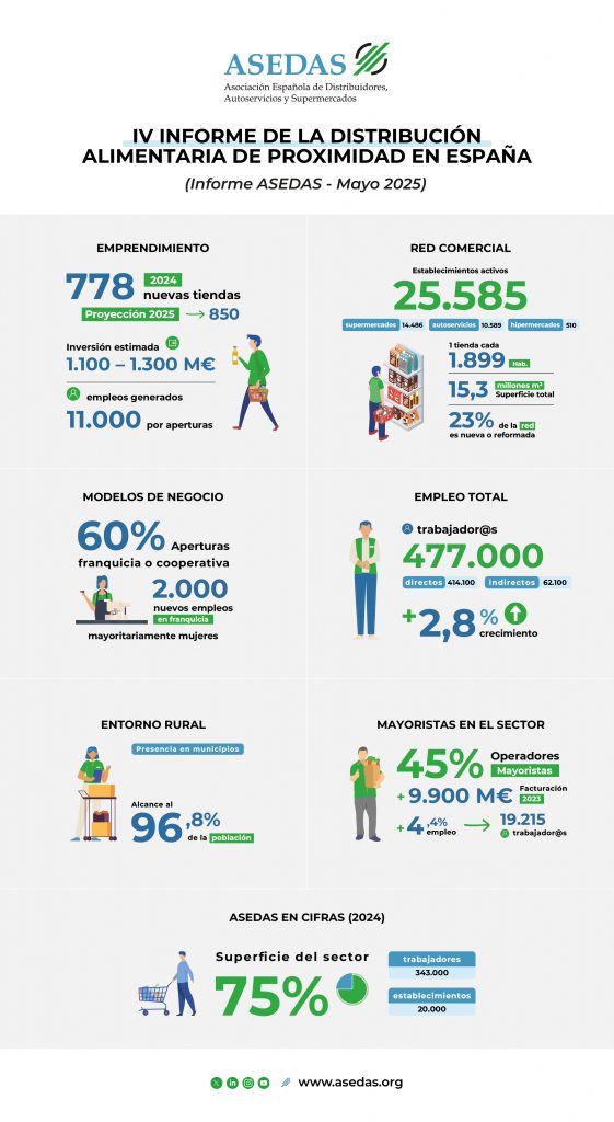 ASEDAS, la asociación representativa de los supermercados y mayoristas de alimentación, ha presentado su IV Informe de Distribución Alimentaria de Proximidad en España, elaborado por Retail Data, donde analiza la evolución del sector en términos de crecimiento de la red comercial, del empleo, de la rentabilidad y de la expansión territorial, entre otros.