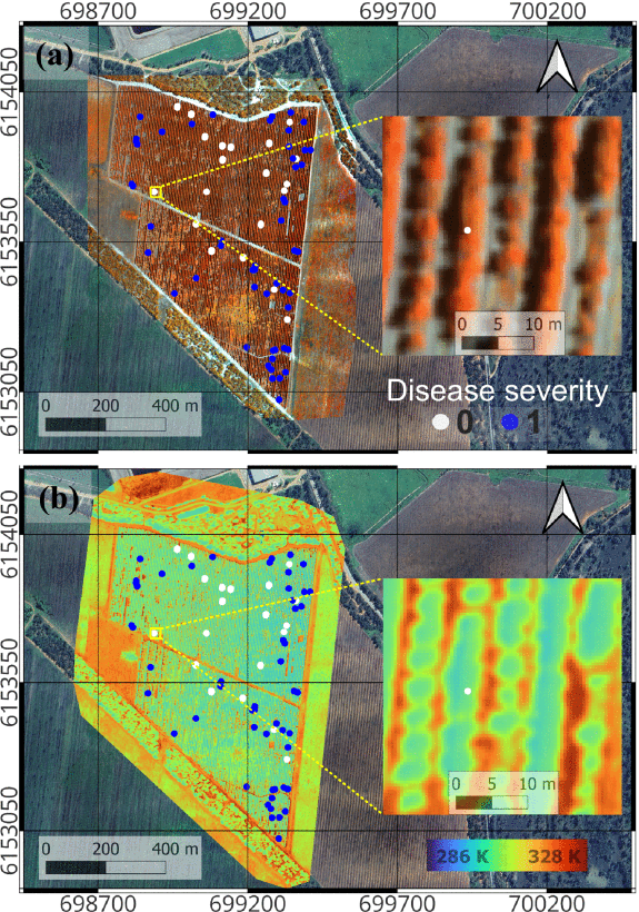 Por otra parte, la investigación liderada por Anirudh Belwalkar y llevada a cabo entre la Universidad de Melbourne (Australia), la Universidad Técnica de Múnich (Alemania) y coordinada por QuantaLab del Instituto de Agricultura Sostenible del CSIC demuestra cómo este sensor hiperespectral subnanométrico capaz de detectar bandas espectrales extremadamente estrechas abren también una nueva frontera en la teledetección de enfermedades. “La imagen subnanométrica nos permitió detectar cambios fisiológicos sutiles y tempranos causados por patógenos vasculares antes de que aparecieran síntomas visibles”, apunta Zarco quien aclara que “combinando imágenes hiperespectrales subnanométricas aéreas con información térmica, pudimos detectar infecciones por Verticillium dahliae en estado temprano en olivos bajo condiciones controladas de estrés hídrico. Esta es una situación en la que la termografía tradicional falla al no ser capaz de detectar cambios en la transpiración inducida por el patógeno, que bloquea el sistema vascular”.